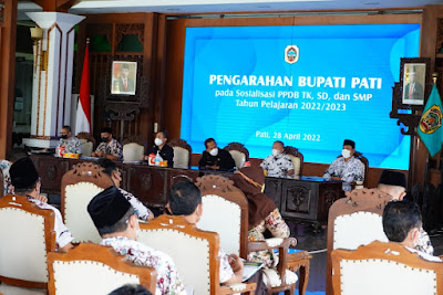 THI. Pati - Bupati Pati Haryanto, memberikan pengarahan sosialisasi Penerimaan Peserta Didik Baru (PPDB) untuk TK, SD, dan SMP pada tahun pelajaran 2022/2023.